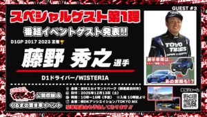 2025.11.07 🚗💨ゲスト第3弾発表💨🚗「番組公開収録&置き車イベント in 渋川スカイランドパーク」 category: イベント 🚗💨ゲスト第1弾発表💨🚗 12月13日(土)開催 「番組公開収録&置き車イベント in 渋川スカイランドパーク」 スペシャルゲスト3目は── 💥 藤野 秀之選手@WISTERIAfukaya (D1グランプリドライバー/WISTERIA) 💥 日本が誇るトップドリフターが渋川に登場‼️ あの伝説のマシンが“見れるかも!?”👀💨 🎟置き車展示申込はこちら🎁豪華抽選会も予定! ▶️ forms.gle/rAHjeBpseALcW8… BACK NEXT